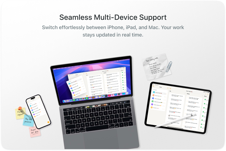 Switch effortlessly between iPhone, iPad, and Mac. Your work stays updated in real time.
