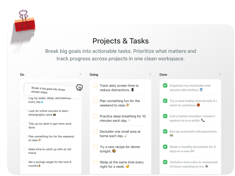 Break big goals into actionable tasks. Prioritize what matters and track progress across projects in one clean workspace.